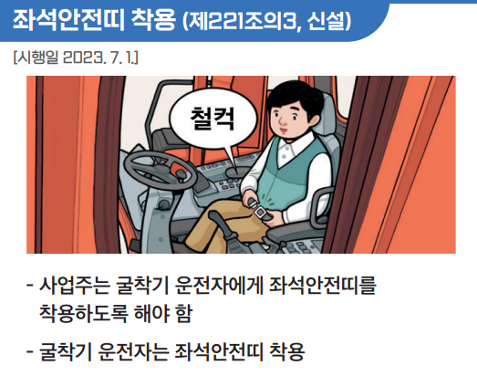 굴착기 운전자가 좌석안전띠(안전벨트)를 착용하도록 해야 하며, 운전자는 이를 따라야 합니다.