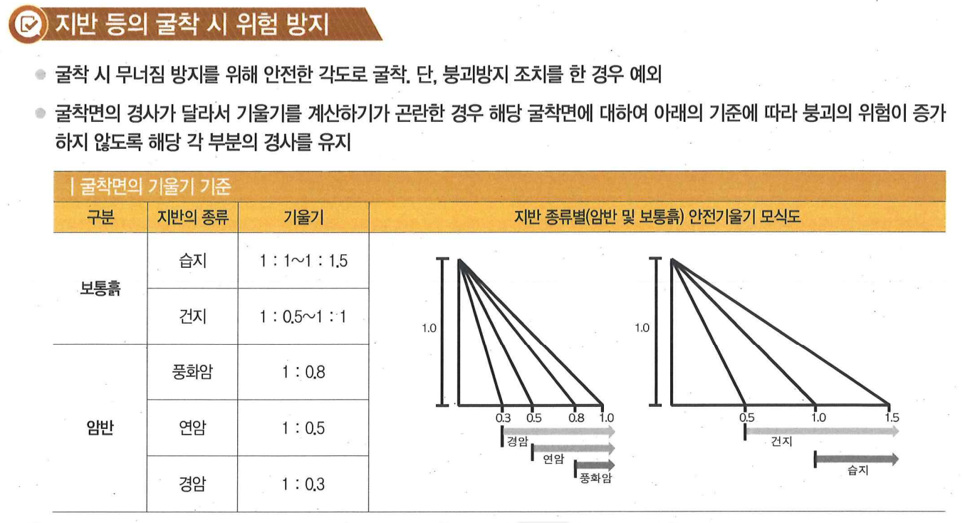 - 지반 등을 굴착하여 사면을 형성하는 경우에는 「산업안전보건기준에 관한 규칙」별표 11의 기준에 맞도록 굴착면의 기울기를 준수 하여야 함